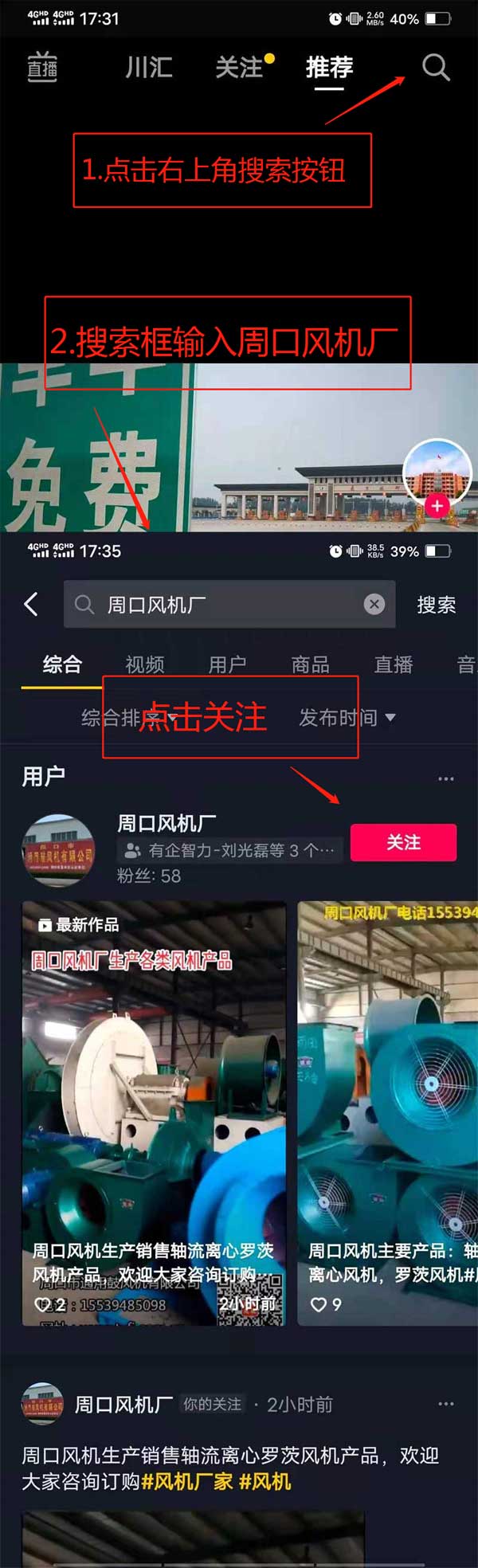 方法二:打开抖音APP,在右上角搜索栏输入:周口风机厂,或者输入抖音号:97903992377